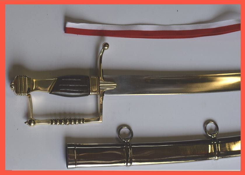 Szabla Naczelnika Tadeusza Kościuszki . Charakterystyczna prostokątna rękojeść szabli którą bardzo często widać na portretach naczelnika z tamtego okresu