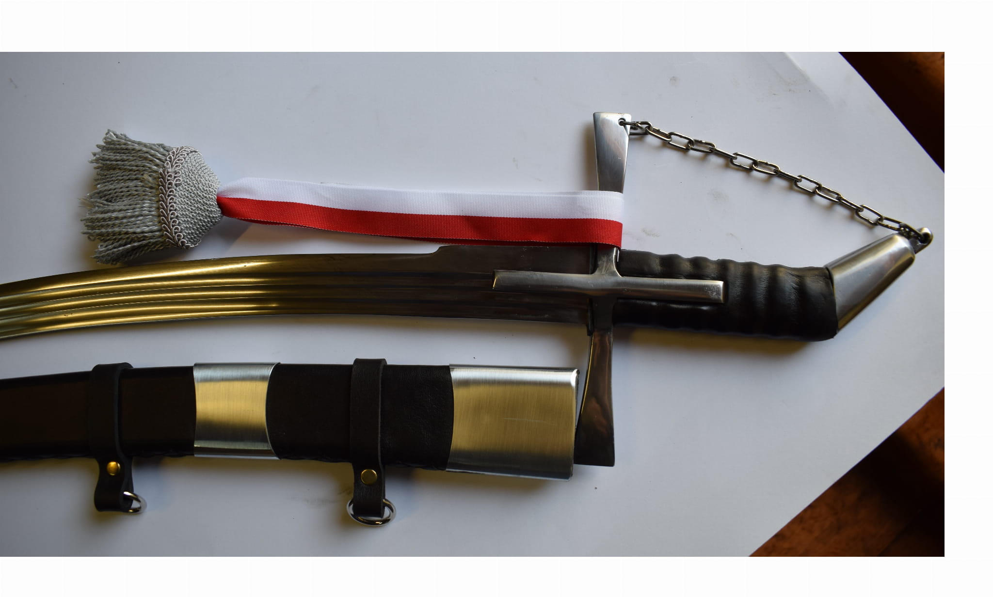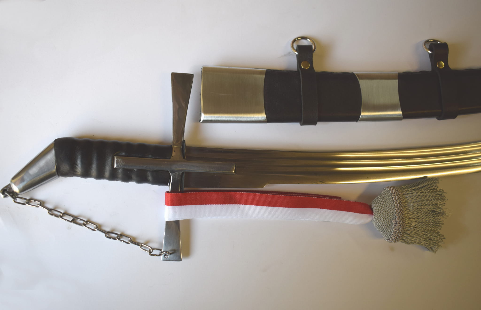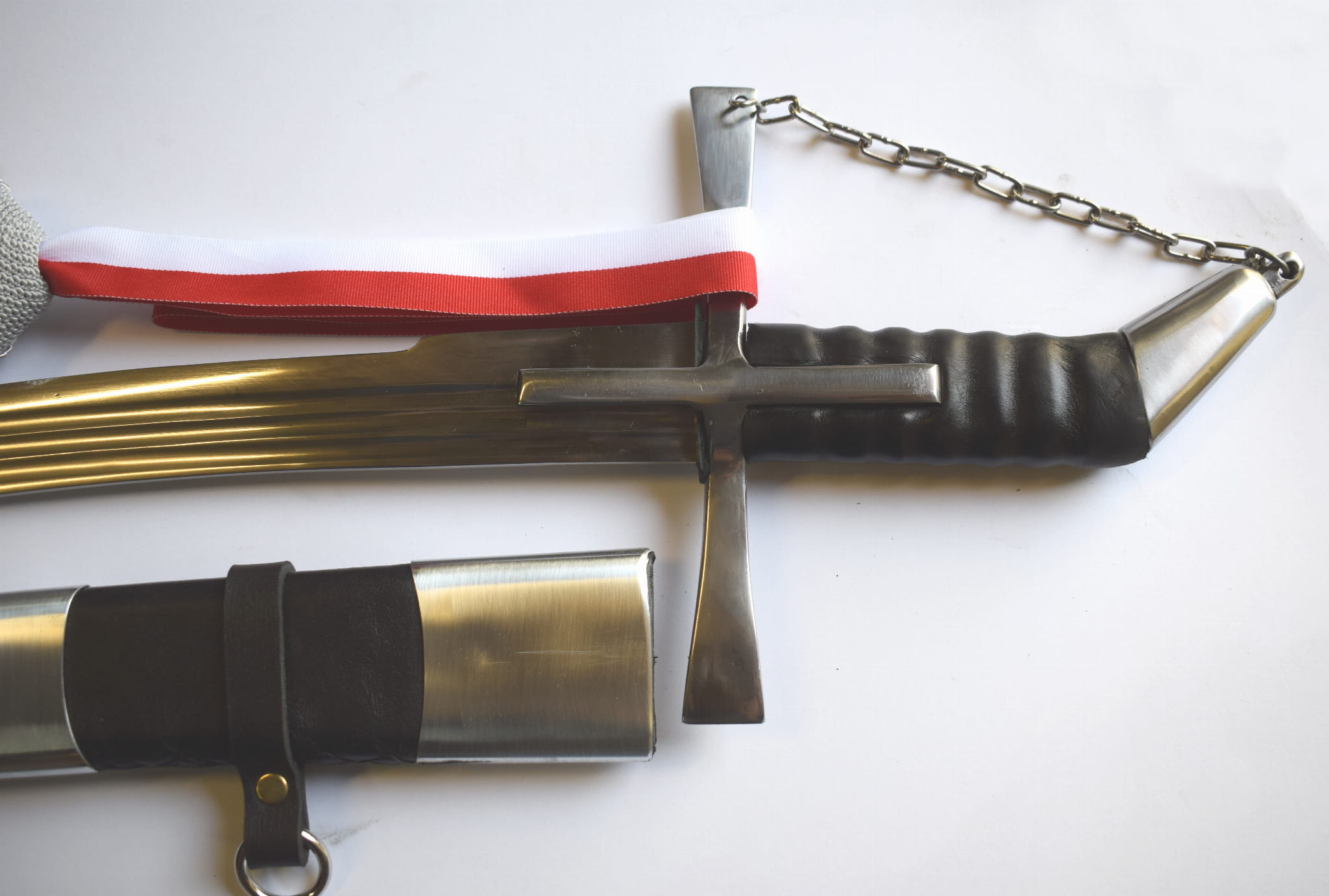 Klinga kuta ze stali sprężynowej szlifowana w trzy bruzdy . Jelec krzyżowy zamknięty z głowicą łańcuchem.