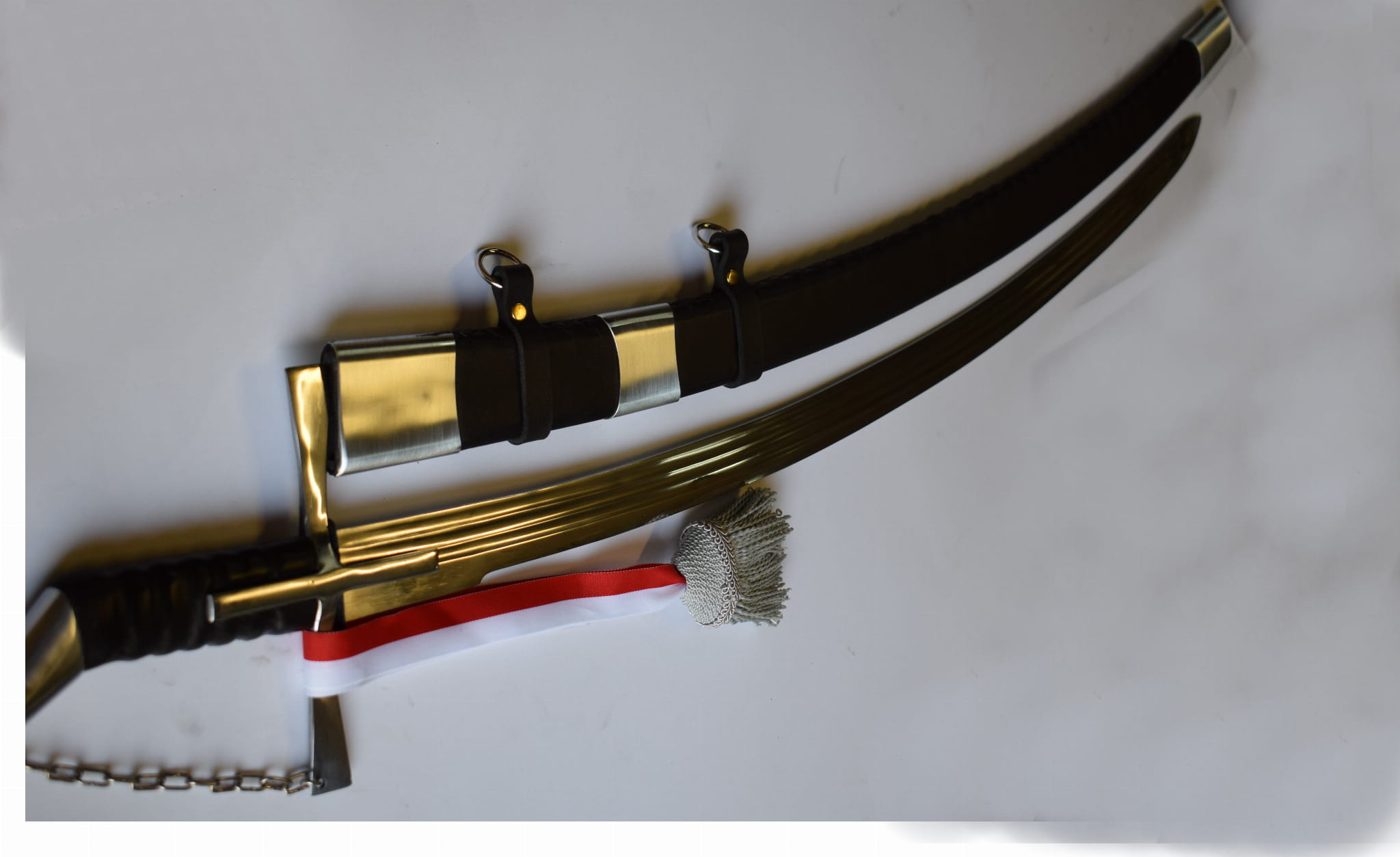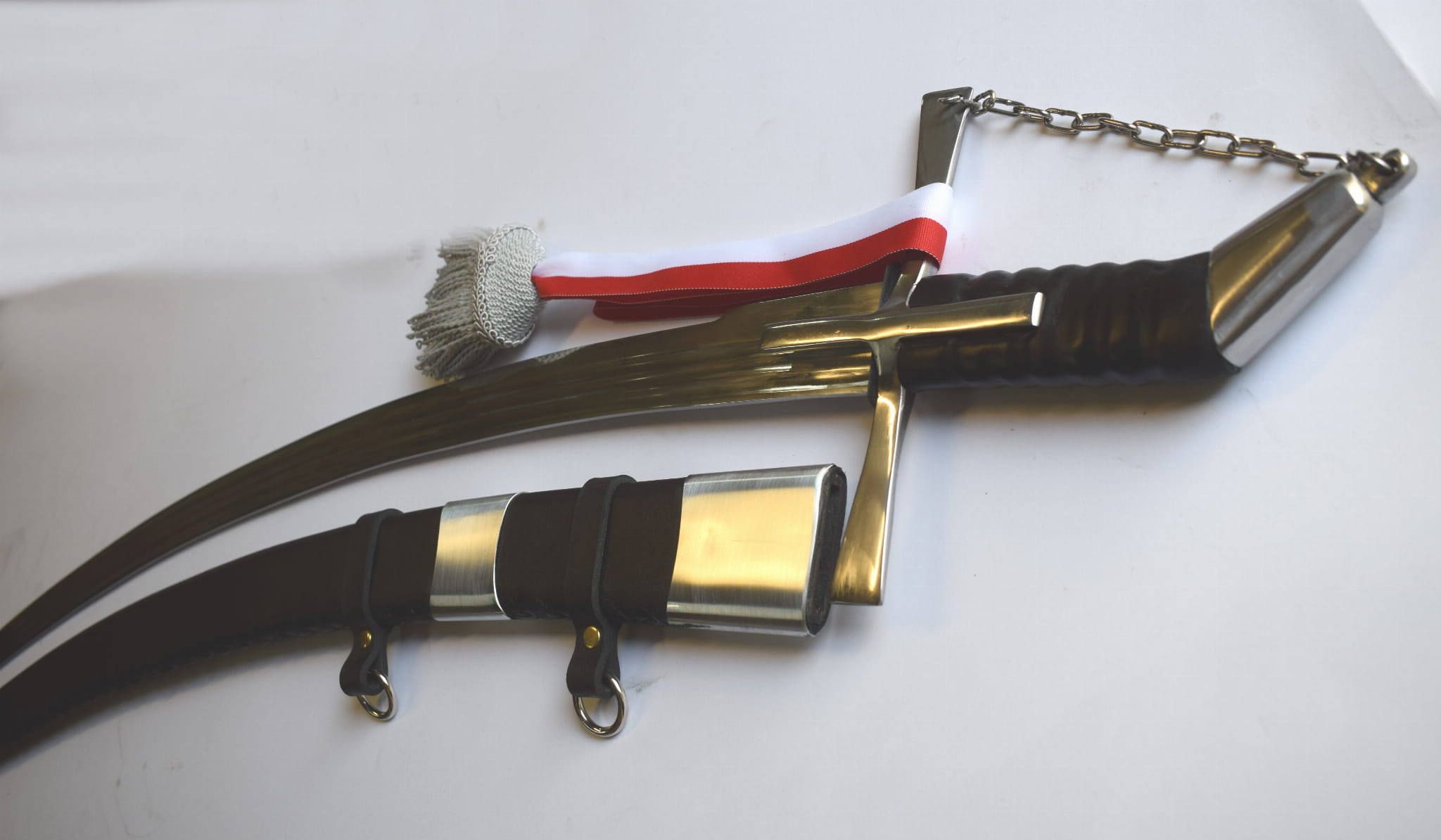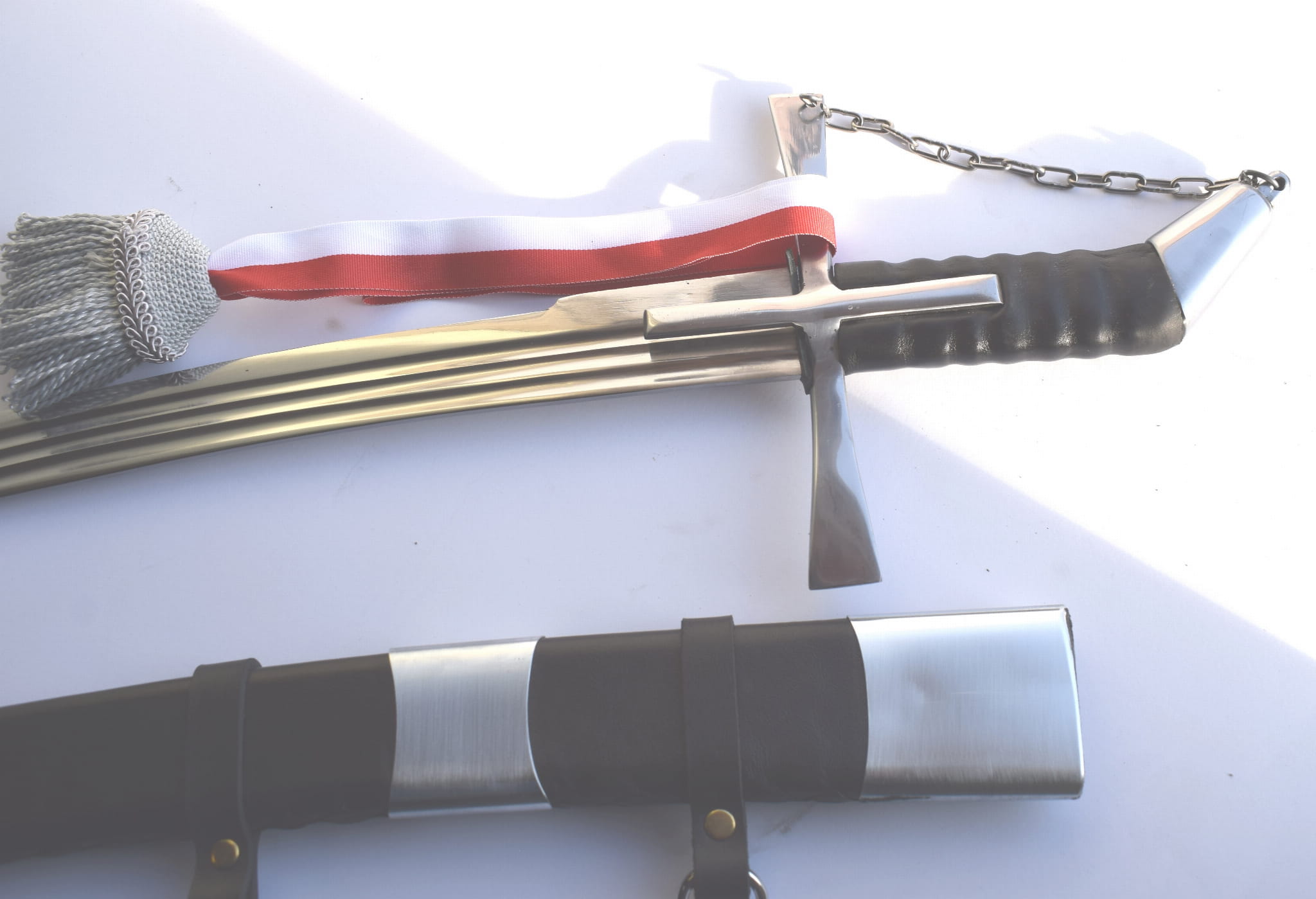 Klinga kuta ze stali sprężynowej szlifowana w trzy bruzdy . Jelec krzyżowy zamknięty z głowicą łańcuchem.